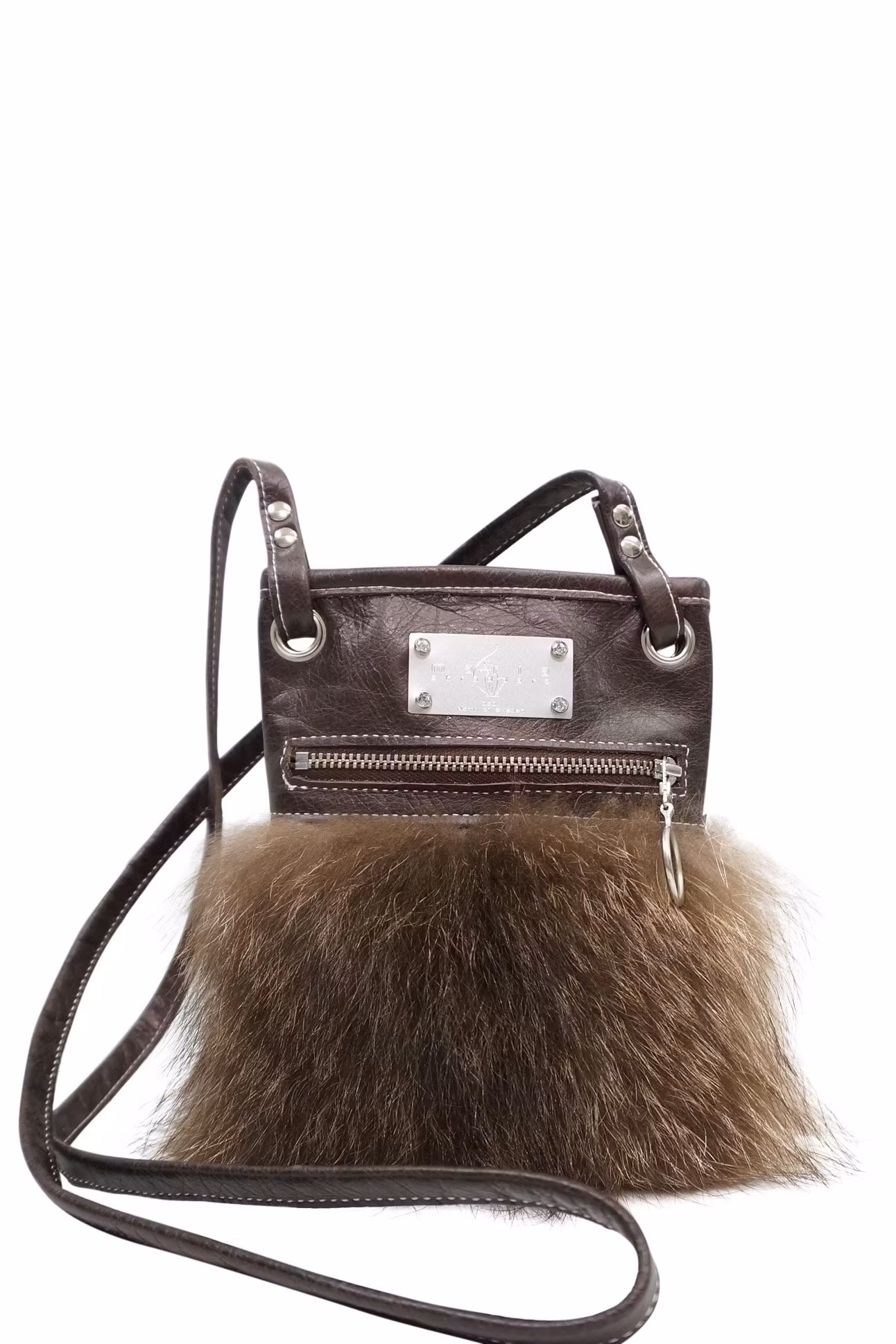 Liten pälsväska. Egentillverkad av mjukt mörkbrunt vaxat, oljat läder och återvunnen päls. Ytterficka med blixtlås. Specialtryckt svart foder i egyptisk bomull.