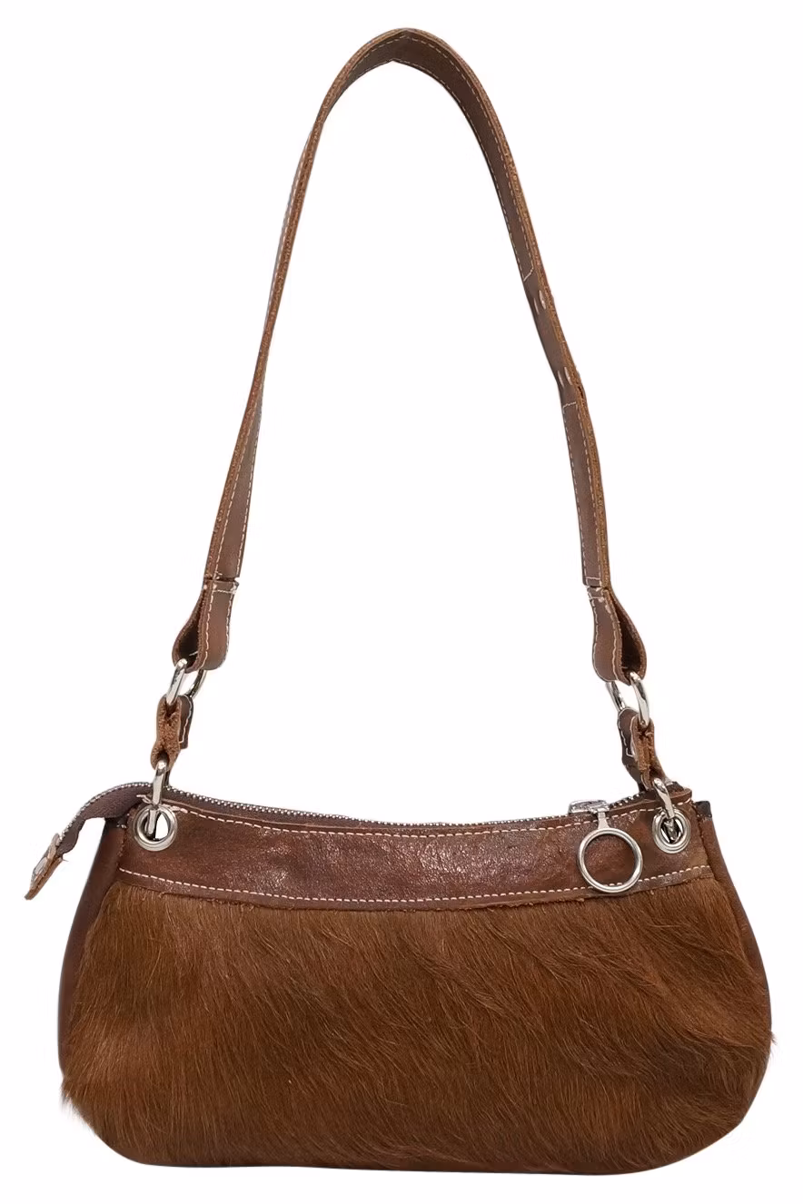 Liten pälsväska. Egentillverkad av svavelgarvat brunt läder och återvunnen kohud. Brunt satinfoder. Ytterficka med blixtlås,samt innerficka.